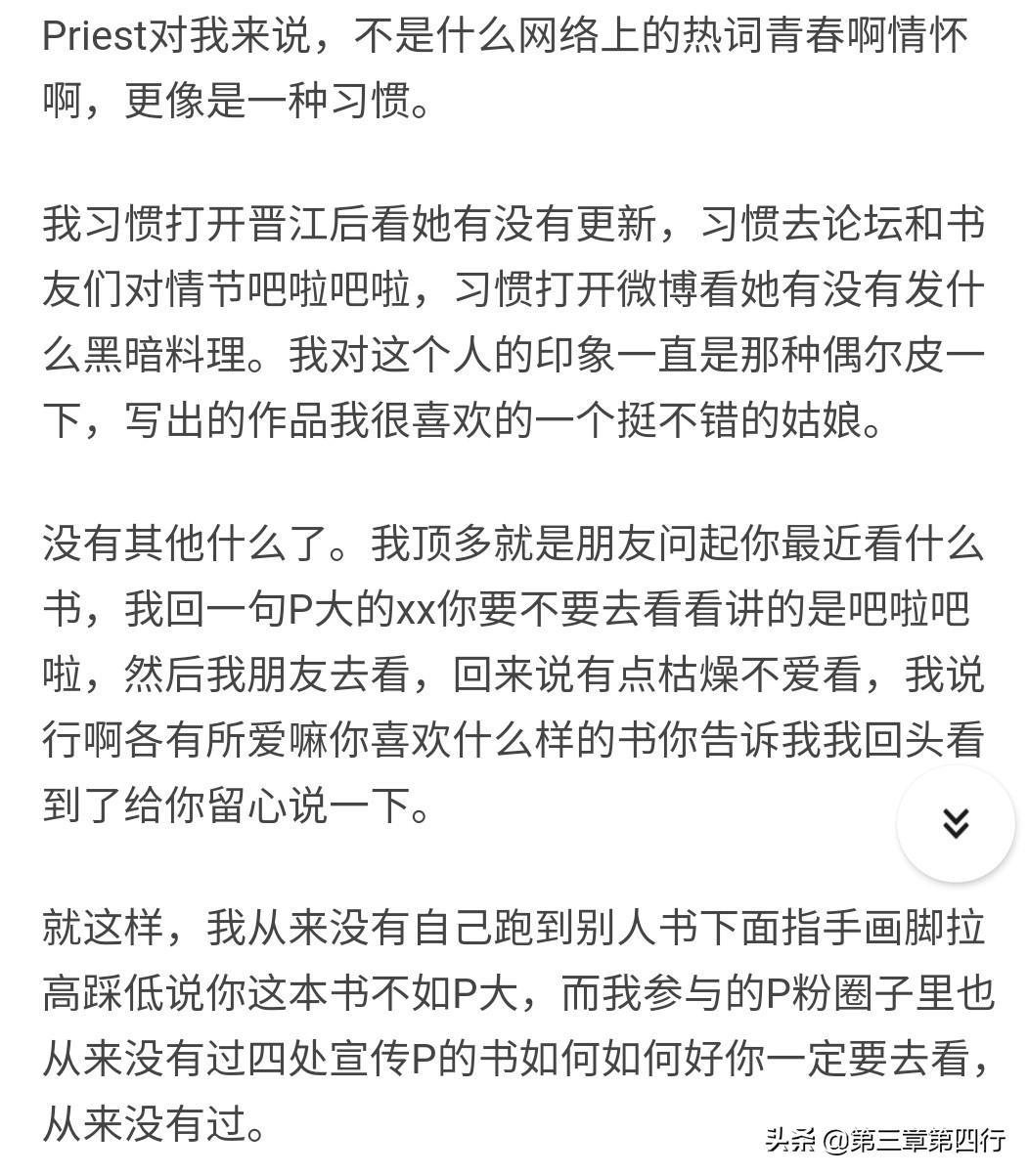 priest,晋江文学城大神级作者之一!江湖人称P大、P神、皮皮、小甜甜等,荣获去年晋江最受欢迎作者称号,晋江作者榜排名第一的作者!