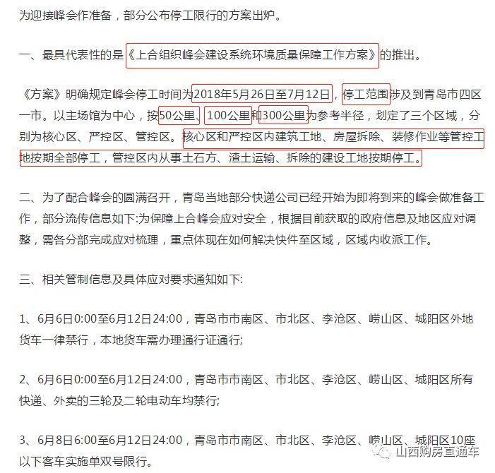 根据距离会场的远近有不同的限制:青岛市四区一市,根据远近程度,半径距离100公里以内的建筑工地、房屋拆除、装修作业等管控工地按期全部停工,半径300公里从事土石方、渣土运输、拆除的建设工地按期停工。