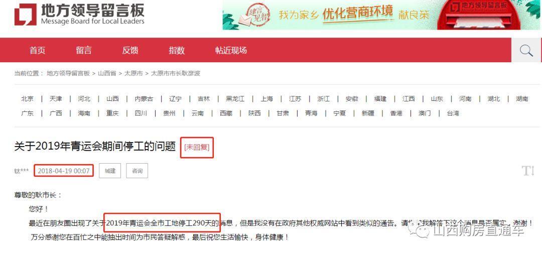 在今年的4月份,就已经有网友在耿彦波留言板留过言,但目前未收到任何回复,并且在太原房产信息网、太原规划网均未查到任何有关停工的文件。