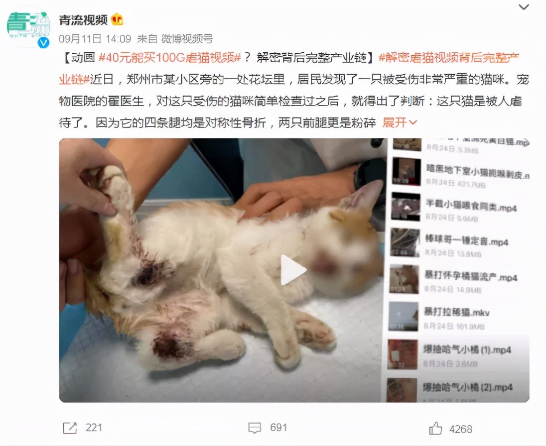 更有甚者,将虐待过程拍成视频,放在网上进行售卖。不仅如此,还将虐猫发展成一条完整的产业链,不断产出虐猫视频,满足看客的变态心理。