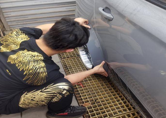 深夜,车子贴完膜,小编还在幸苦得把轮眉上车
