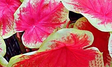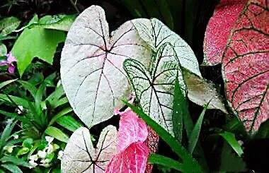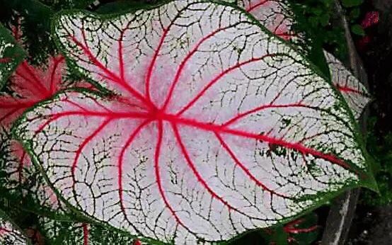 血心五彩芋·是较为优良的品种。叶片中心为玫瑰红色,边缘是白色的,叶面有绿色斑点。是较为优良的品种。