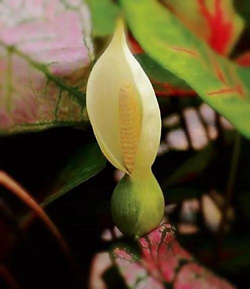 彩色芋自然花期3-5月,开花的时候,花苞像个微型的葫芦,亦像个包着头的小姑娘。花姿优美,观赏性较高。