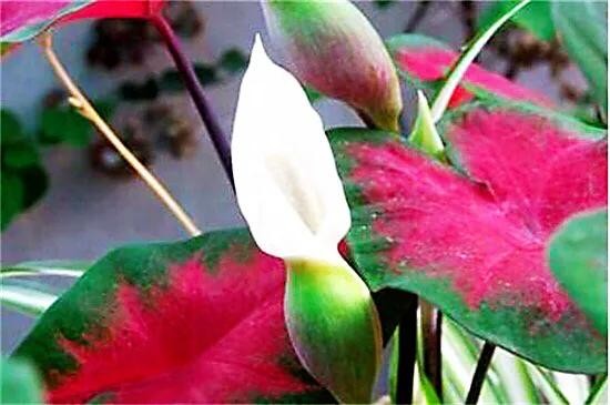 五彩芋·别称:彩叶芋、两色芋。天南星科五彩芋属多年生常绿草本植物。是热带、亚热带常见的观叶植物,品种繁多。其叶如鲜艳的彩色画板,且花形有情趣。6-10月为生长盛期。
