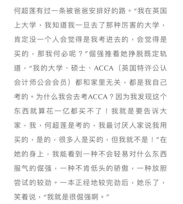 赌王曾试图花钱把何超莲安排进世界一流的大学,但何超莲却拒绝了他的安排,固执地要去英国读大学,何超莲说自己不希望被别人说自己的大学文凭是买来的。