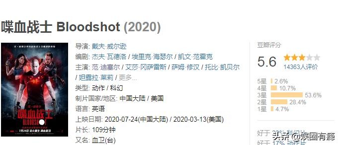 单日票房第二的《喋血战士》则是 范·迪塞尔的新作,这一位凭借《速度与激情》在国内封神,然而他也是一个不折不扣的“烂片王”,他的这部新片也是典型的好莱坞工业流水线烂片,却依然能取得不错成绩。