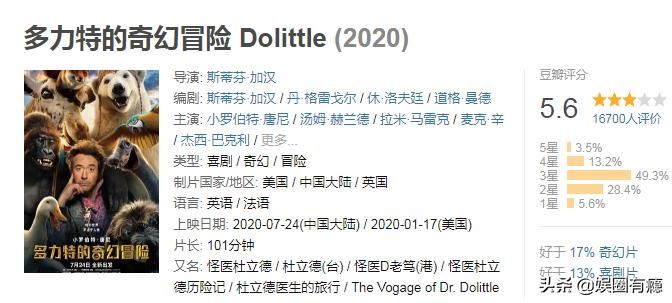 现实的表现就是大部分人宁愿选择新片,所以一部打着特效冒险片旗号但明明是儿童向电影《多力特的奇幻冒险》也能在国内市场拿下单日票房冠军。虽然这部电影是“钢铁侠”唐尼在漫威系列电影之外首部作品,而且电影投资高达1.75亿美元,但这部电影的质量完全对不住这样高的投资。