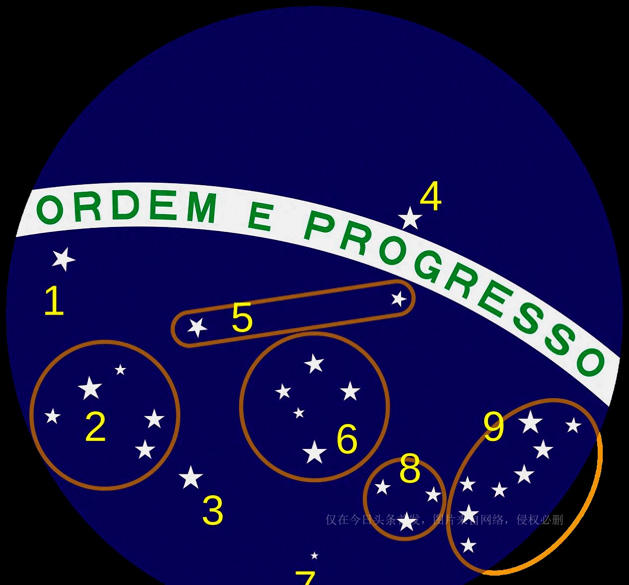 其中,1号星座代表亚马逊州,反映了巴西面积最大的州。4号星座对应着帕拉州,是巴西第二大州,位于北半球。而7号星座代表了首都巴西利亚所在的联邦区,尽管面积较小,但地位显赫,如同南半球天空中的南极星,代表着首都的重要性。