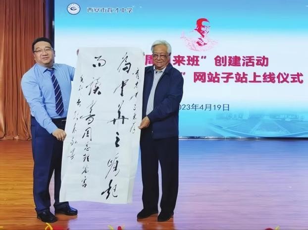 中央党史和文献研究院二级巡视员、周恩来思想生平研究分会秘书长李清平专程来到西安市育才中学,宣布《中国中共文献研究会关于同意与西安市育才中学联合创建“周恩来班”的复函》,并向该校高2022级7班班主任授予“周恩来班”旗。同时,周恩来思想生平研究会常务理事、全国周恩来班网站总监胡长安向该校颁发子网站开通证书。