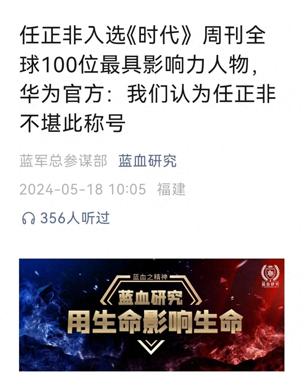 2005年4月,任正非被《时代》周刊评选为“有影响力的人物”。华为立即发出声明:“事先公司并不知情,公司过往从来没有就此事与《时代》周刊有任何往来,不知他们是因何评选任正非的。我们认为任正非是不堪此称号的。”
