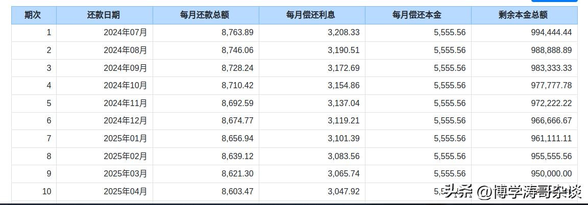 图片非常直观,每个月的还款金额,等额本金比等额本息贵很多,但是,请注意,等额本金多出来的那部分金额,是每个月多支付的本金,两种还款方式每个月支付的利息(也就是损失)几乎是相同的,只有几块钱的差距!