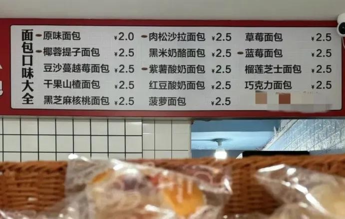 更狠的是价格组合拳:椰蓉、肉松等基础款定价2元,黑米奶酪等“升级款”卖2.5元,还常推出“买二送一”活动。这种定价直接打穿行业底线,连超市冷冻面包都难敌攻势。