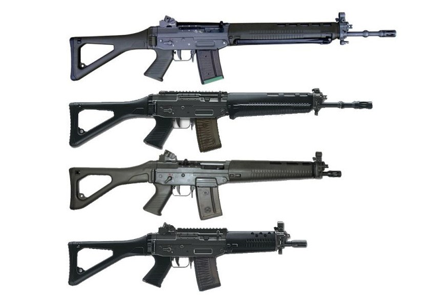 SIG SG 551卡宾枪,配有较短的枪管它有短枪管和长枪管版本,它与GL5140 枪挂式榴弹发射器兼容。SIG SG 552紧凑型突击步枪,它与卡宾枪类似,但具有更短的枪管。还有SIG SG 553,是SG 552的最新版本。SIG SG 550狙击型,更长的枪管的,新的折叠式枪托,手枪式握柄等有一些改进。这变种型号是为瑞士安全部队专门设计的,已不再生产。还有SIG SG 556半自动版为民用客户和执法部队,它与标准的北约(M16型)弹药兼容。
