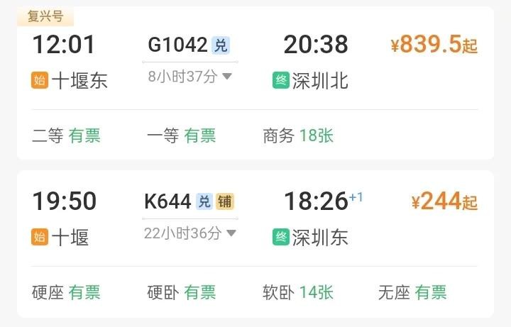 可以看出价格还是比较实惠的,比十堰到深圳的高铁G1042明显便宜不少,G1042二等座都要839.5,但高铁的优势就在于速度快,全程只需要8小时37分,主要就看个人的需求自行选择了。