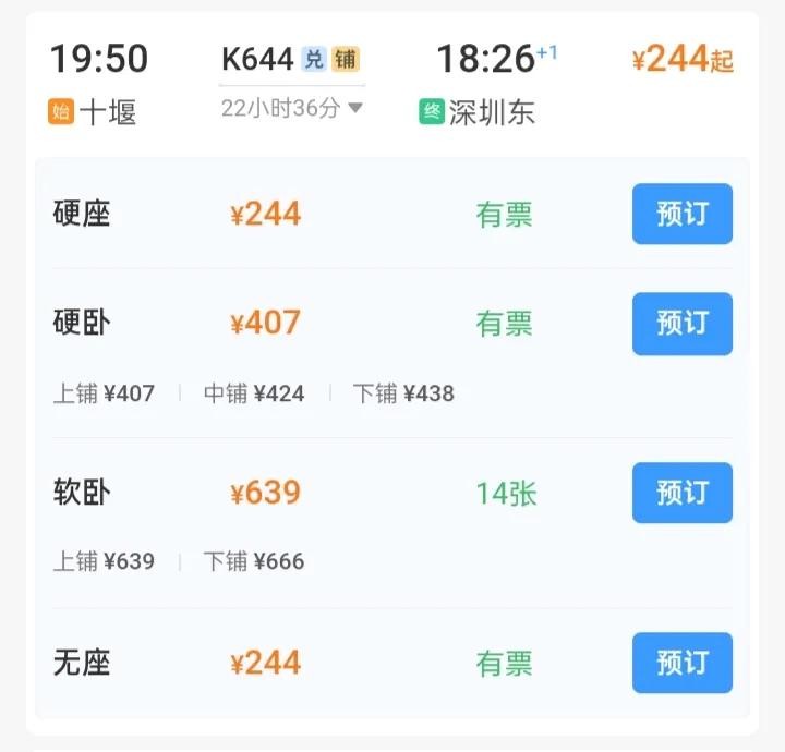 K644全程硬座244,硬卧407,软卧639
