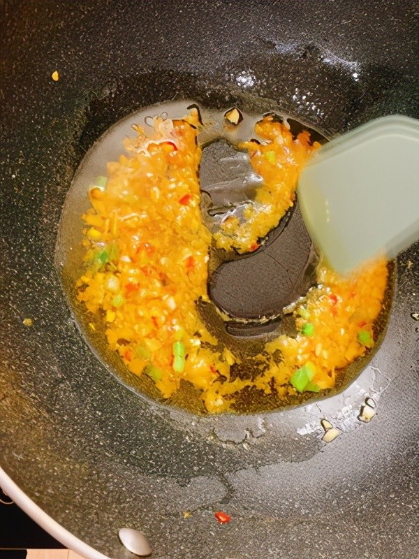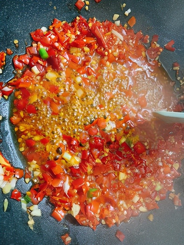 6.秘密㊙️:锅里一勺油炒一半的姜末蒜末葱白 炒香加入半瓶红剁椒酱,炒香加入一勺蒸鱼豉油 一勺糖 一勺料酒 少许白胡椒粉 炒匀