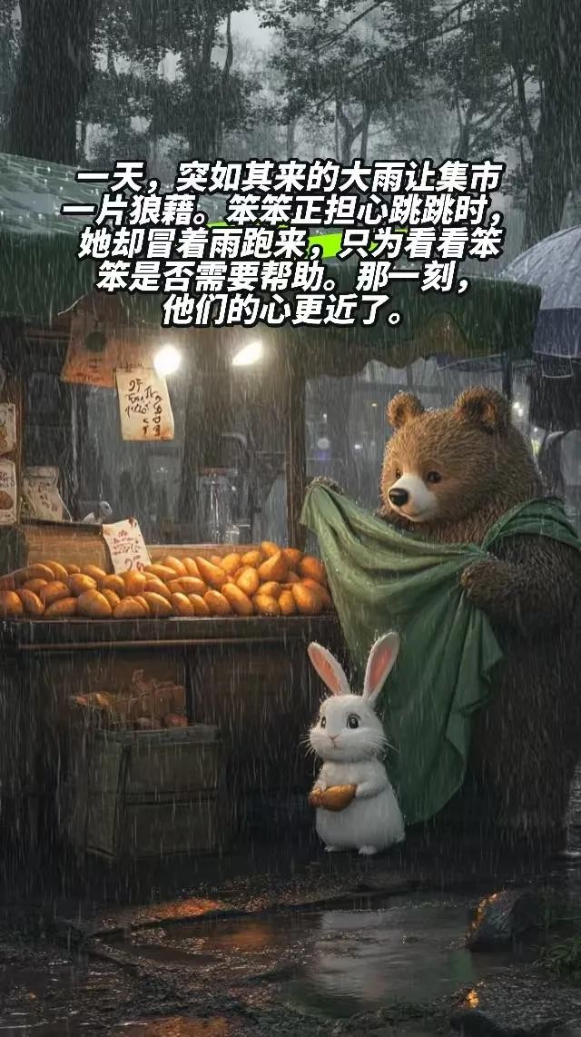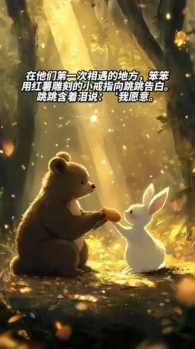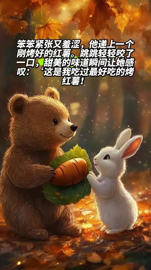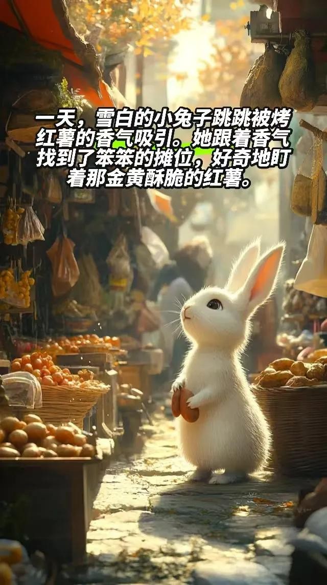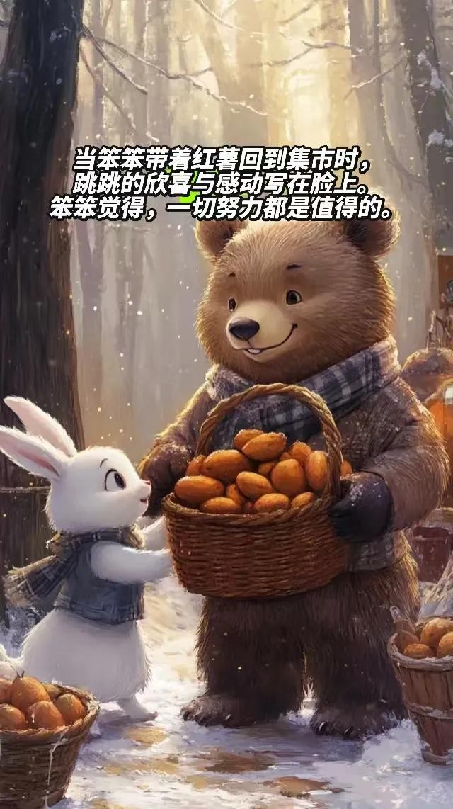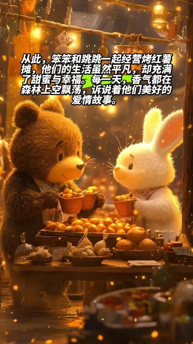 在森林的小集市上,有一只勤劳的小熊笨笨,他用自己满满的热情经营着一个烤红薯摊。每天,红薯的香气弥漫在集市上空,也慢慢飘进了一只雪白小兔子跳跳的心里。