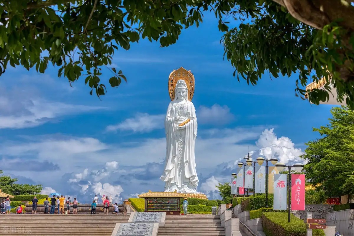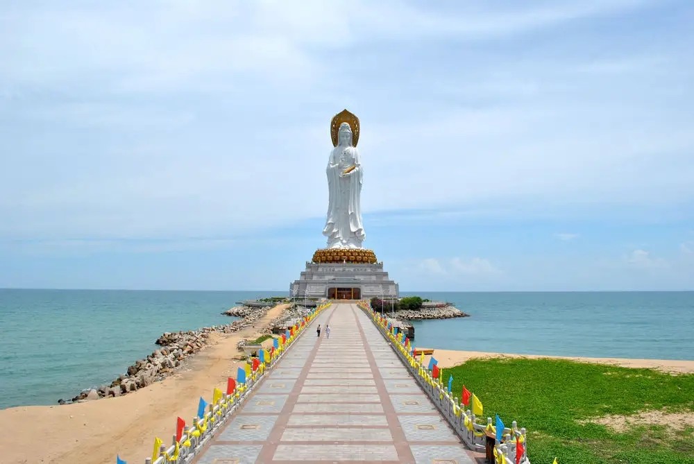 海南三亚“南山海上观音”,是1993年中国国务院宗教局和海南人民政府批准兴建三亚南山寺时准备建造的,属于南山文化旅游区。此像观音圣像一面手持莲花,另一面手持经书,还有一面是手持佛珠,象征和平、智慧与慈悲。为正观音的一体化三尊,造型巍峨壮观,实乃世界造像之最。