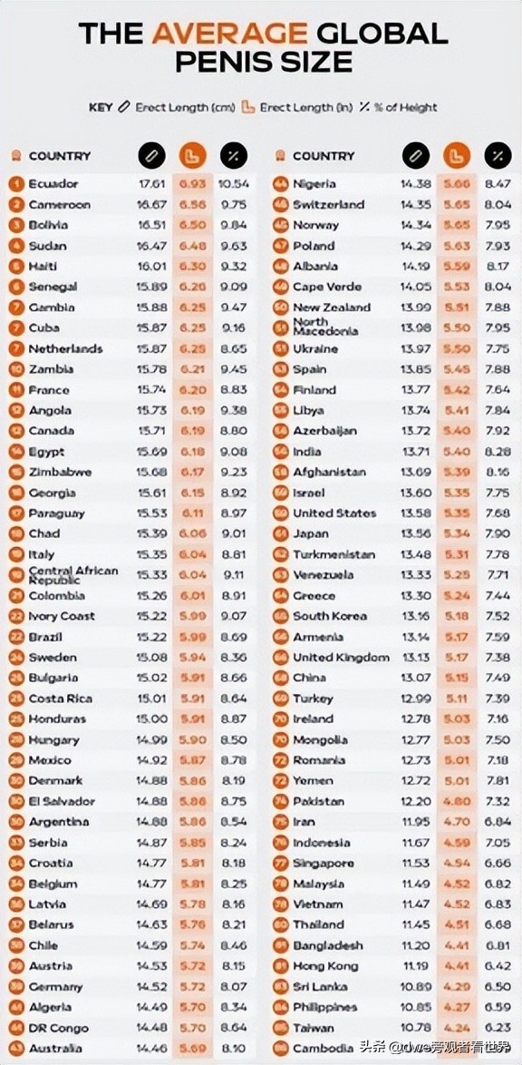 南美国家厄瓜多尔和非洲国家喀麦隆的男性长度最长,平均近17厘米。中国排名第69,平均13.07厘米,略低于全球平均值。香港排名第84,平均11.2厘米,接近榜末;柬埔寨排最后,平均长度10.04厘米。专家认为,肥胖是影响生殖器大小的重要因素。