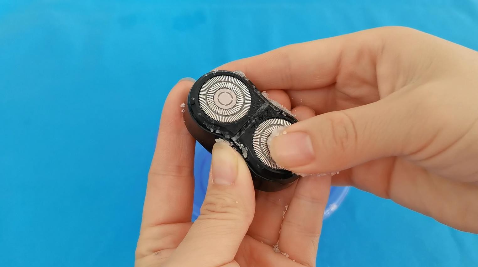 我们将剃须刀的刀片取下来下来,然后将其放入放入水中浸泡一会儿,接着拿出来用纸巾擦干,然后撒上一把食盐,用手指慢慢的揉搓,这样会将剃须刀上面的一些细小污垢和皮屑揉搓下来,而且食盐是颗粒的,还可以对刀片起到打磨的作用