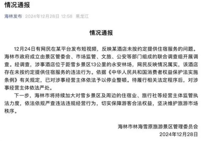 事发几天后,12月28日从海林市林海主管部门获悉:经调查走访,相关旅客的投诉属实,该酒店存在未按约定提供住宿服务的违法行为。依照规定,对涉事经营主体依法予以停业整顿。