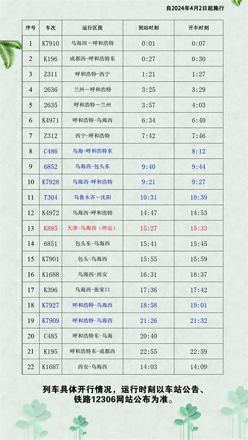 途经乌海西站旅客列车时刻表