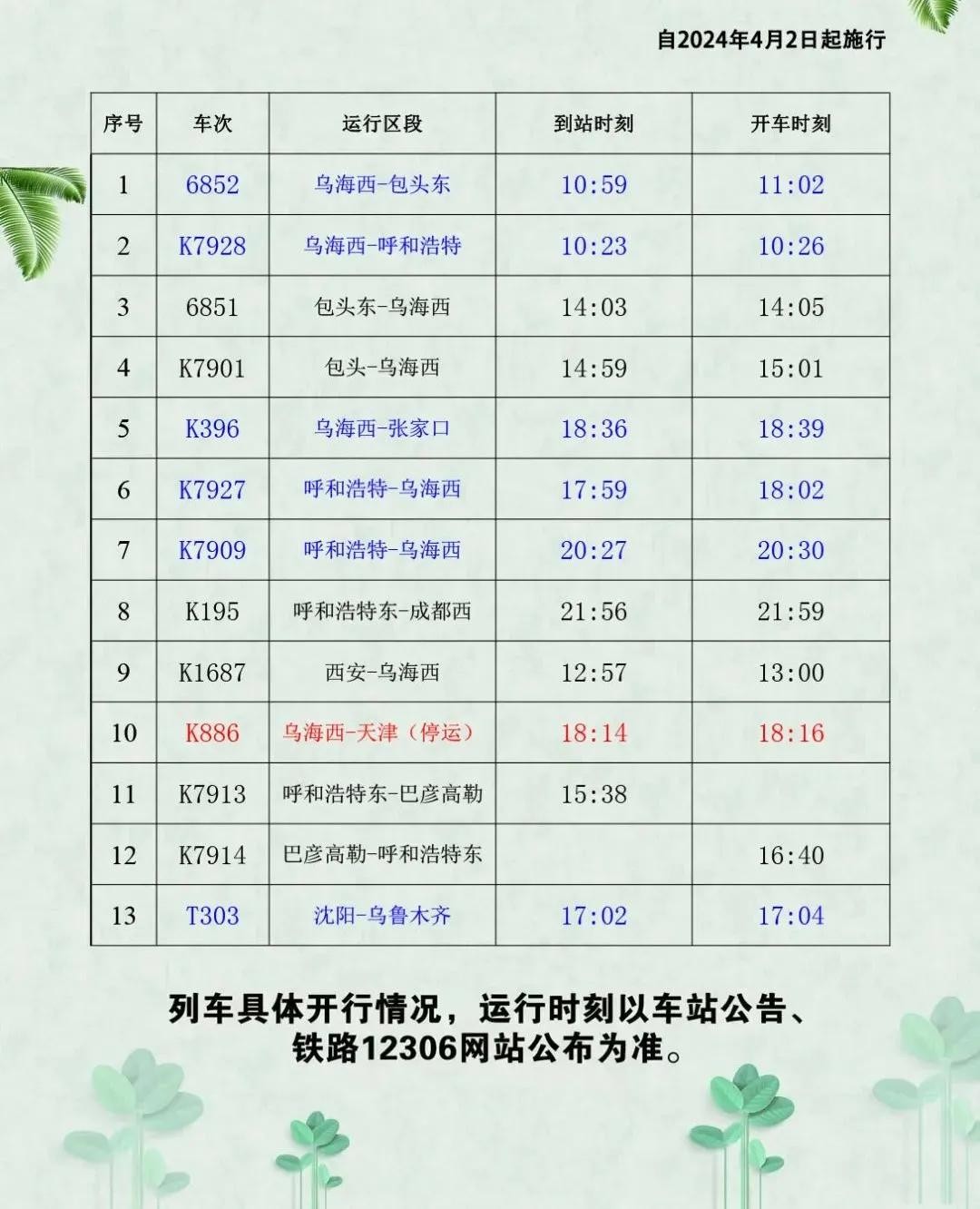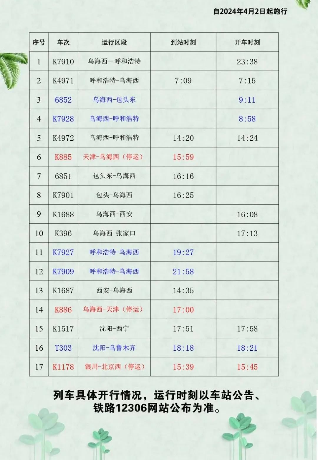 途经乌海多个车次有变!