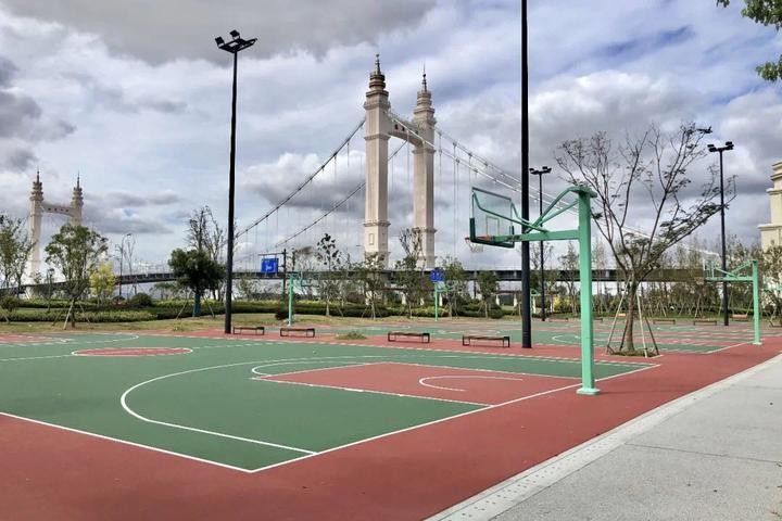 在公园A区,“飞碟”建筑西侧,配置了4个标准篮球场,到了夜晚也会进行灯光照明,为市民运动锻炼提供便利。