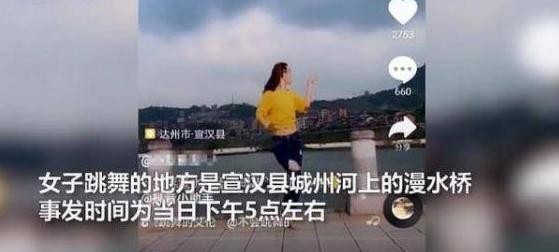 视频中,年轻女子打着赤脚欢快地跳着舞。据了解,女子跳舞的地方是四川达州宣汉县城州河上的漫水桥,时间为5月2日下午5点左右。 据知情人士介绍,视频中的女子姓彭,为县城一家舞蹈工作室的老师,同时也是该舞蹈工作室的合伙人,自己的儿子就是她的学生。从该女子抖音号上看到,她身前共发了59条抖音视频,绝大多数都是跳舞的。