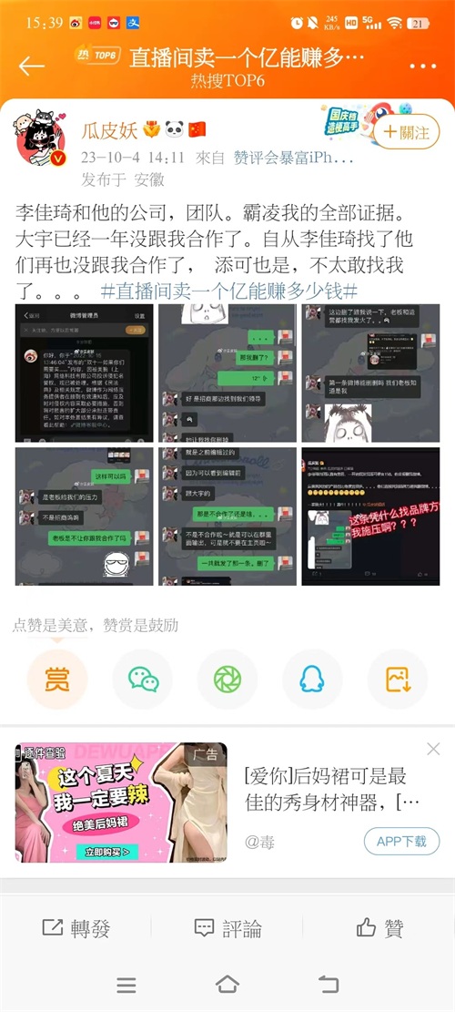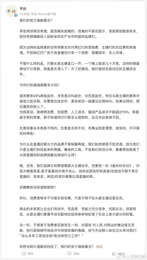 最后,也有些商家因此不满。他们提出这样会加大他们的经营成本,并控诉经营不易。比如有些国货品牌就发言称↓丰丝官微发博怒斥头部主播是“毒瘤”:品牌沦为他们赚钱的工具