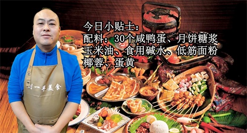 30个咸鸭蛋、月饼糖浆、玉米油、食用碱水、低筋面粉、椰蓉、蛋黄