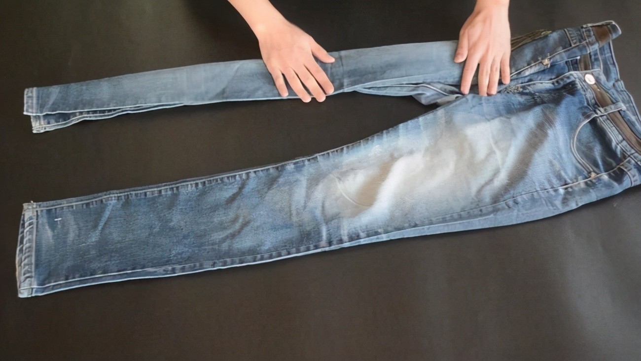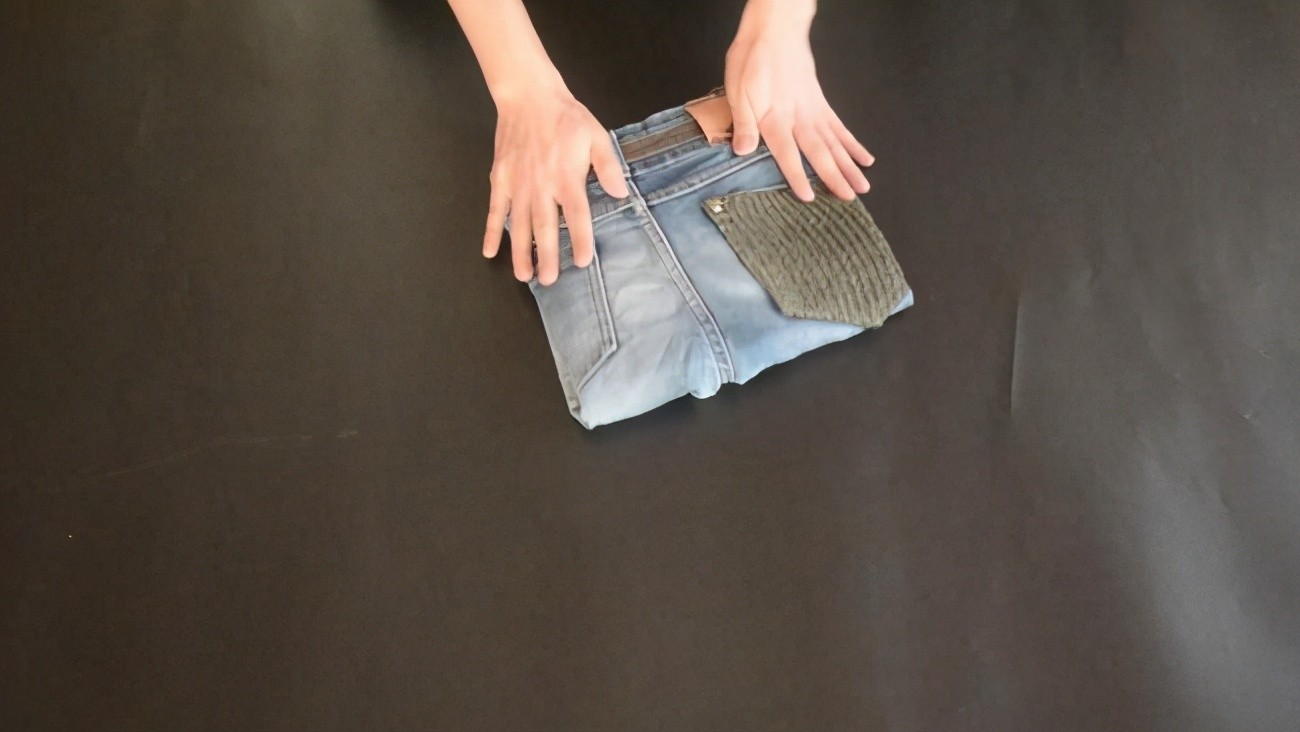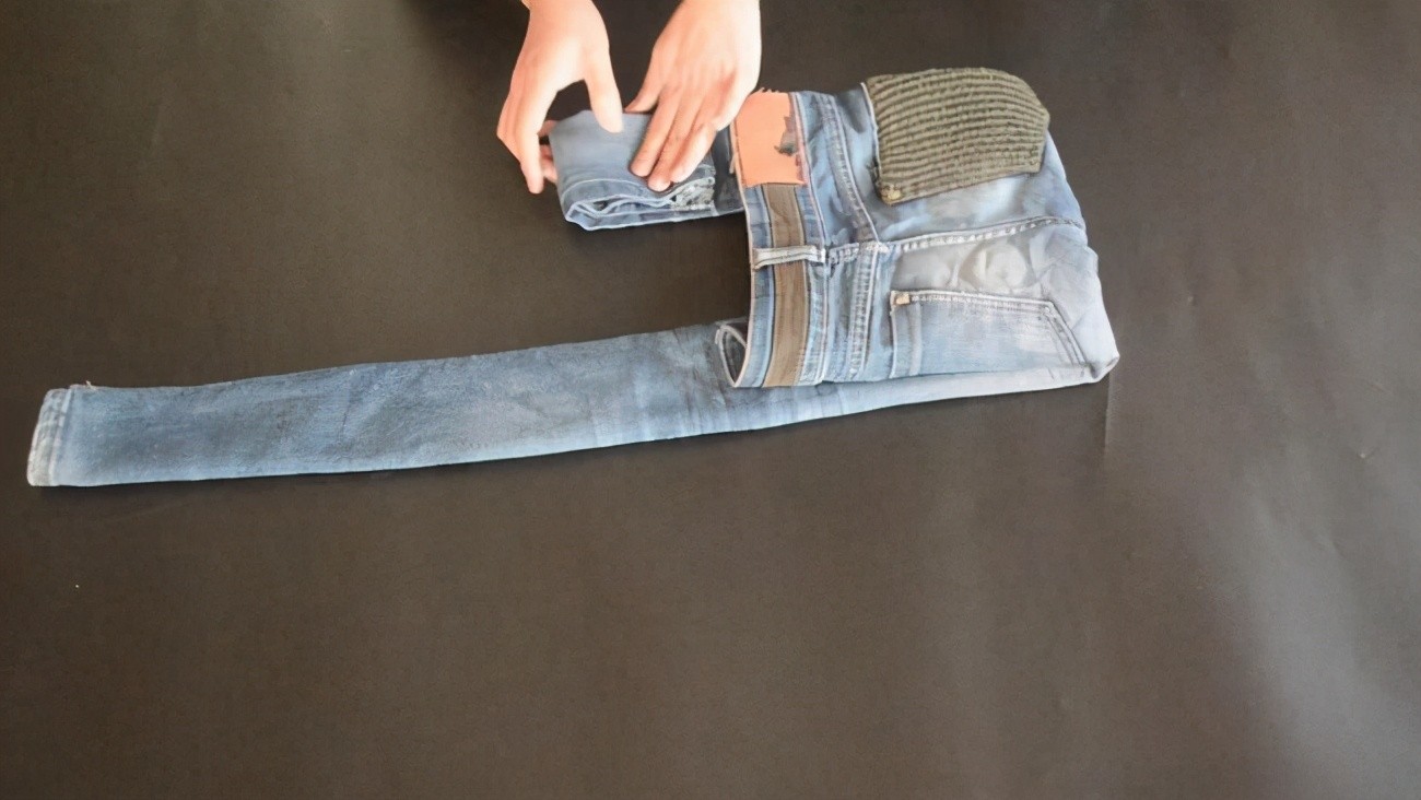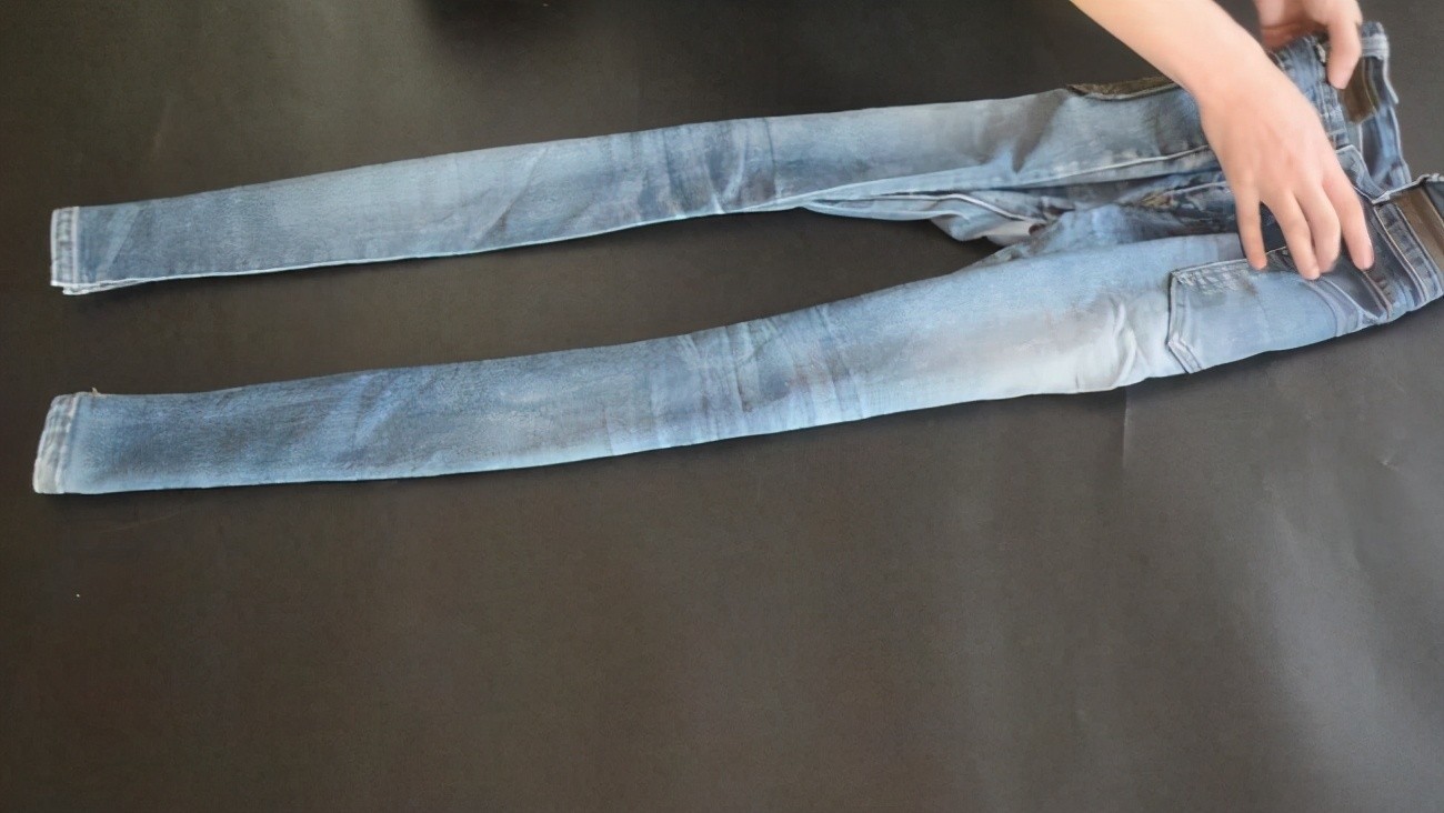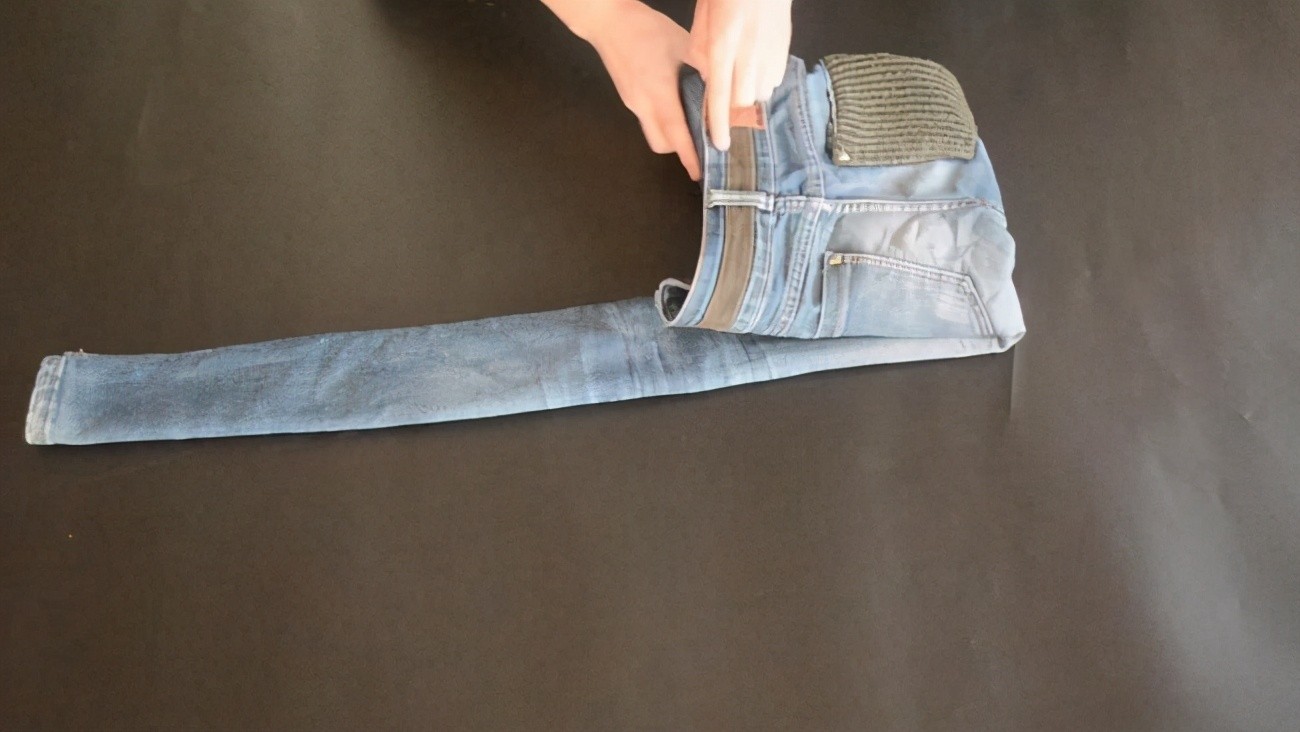 03、将两条裤腿分别对折以后,再把牛仔裤的腰部向下翻折,这样的折叠方式可以放牛仔裤看起来更加整齐。而且也是一种比较节省空间的方式,折叠完成以后不容易零散,更容易存放。