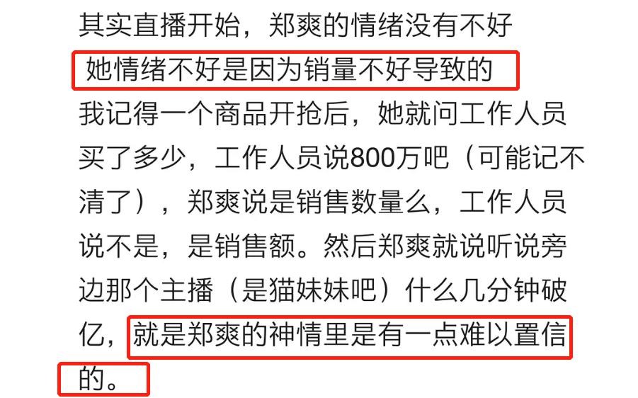 在某个商品开抢后,郑爽问了工作人员的销量,对方说是800万销售额,郑爽立马就说和她合作的那个主播不是几分钟破亿吗,神情里是难以置信的感觉。