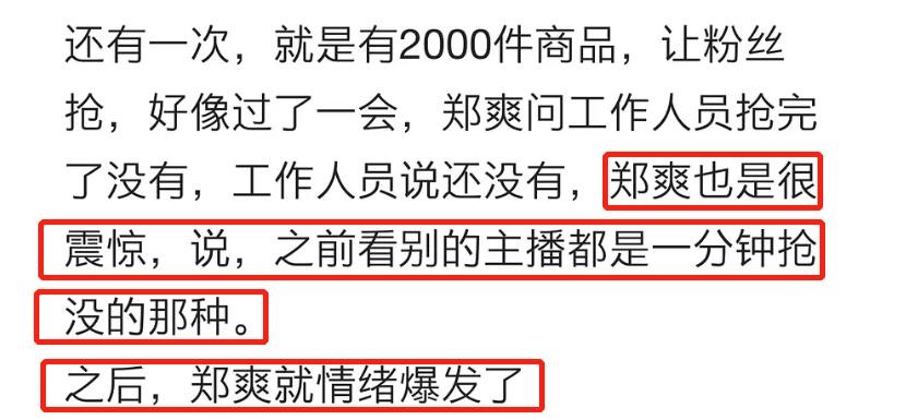 还有一个2000件的商品,在上架后,过了一会郑爽问工作人员抢完了吗,在得知没有之后,郑爽一脸震惊,还说了句之前看别的主播都是一分钟抢完,没过多久,郑爽的情绪就爆发了。