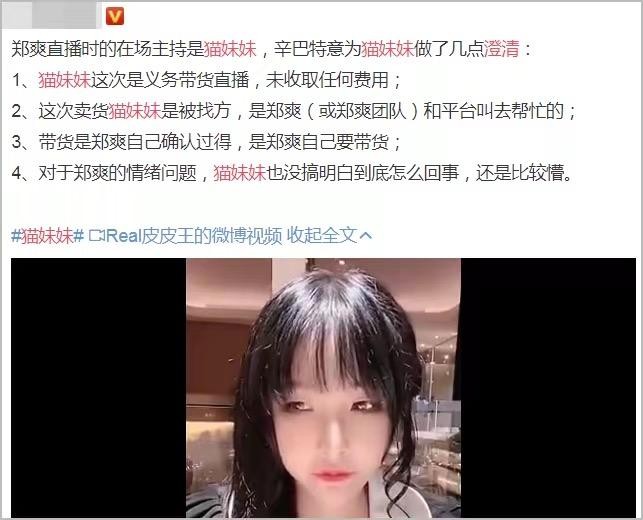粉丝解说是郑爽在直播的时候,发现多了很多计划外的东西,于是开始控制不住情绪,但其中一位主播却回应自己是被郑爽找去帮忙的,并且没有收取费用,带货也是郑爽自己确认过的,是她自己要带货。