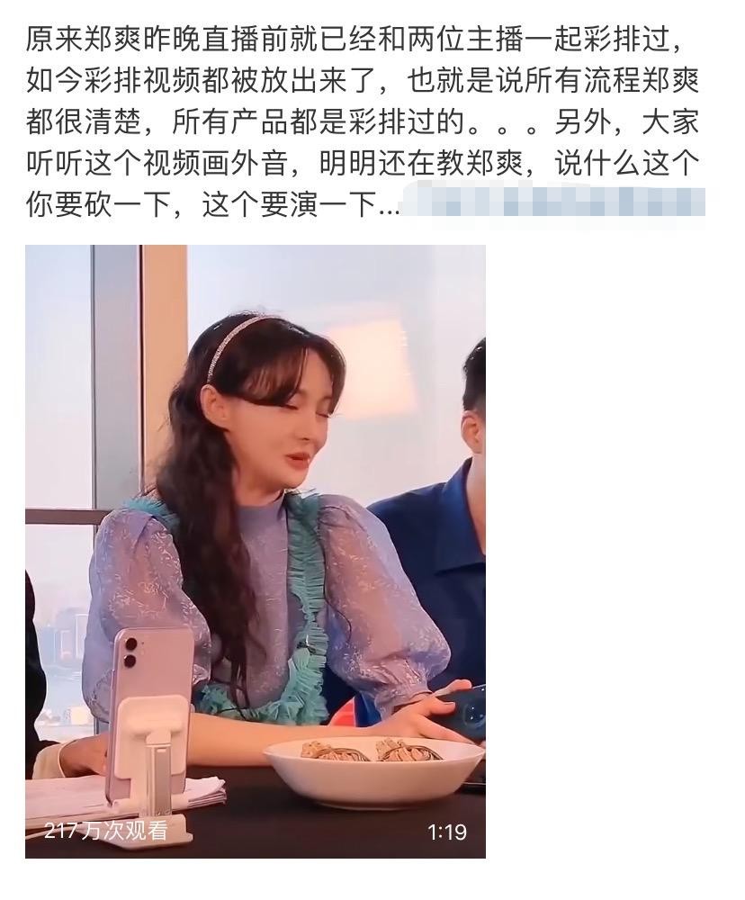 随后有网友曝光了在直播前,郑爽和其他两位主播是彩排过的,也就是说流程她是清楚的,两位主播还教郑爽要砍价要演一下,所以并不存在郑爽不知道是怎么一个销售模式,更不用谈自己不接受这样的商业化。