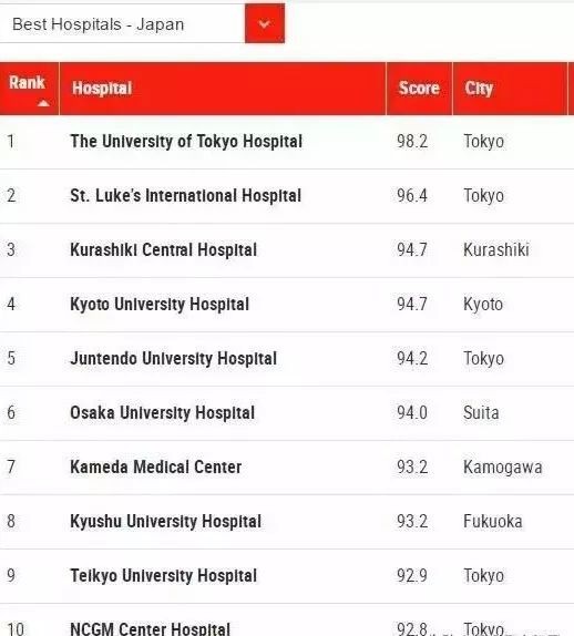 本次排行中,日本东京大学医院名列第八,成为日本唯一一所冲进全球医院排名前十的医院。