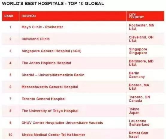 排名前十中还有同样来自美国的克利夫兰诊所、约翰霍普金斯医院、麻省总医院。