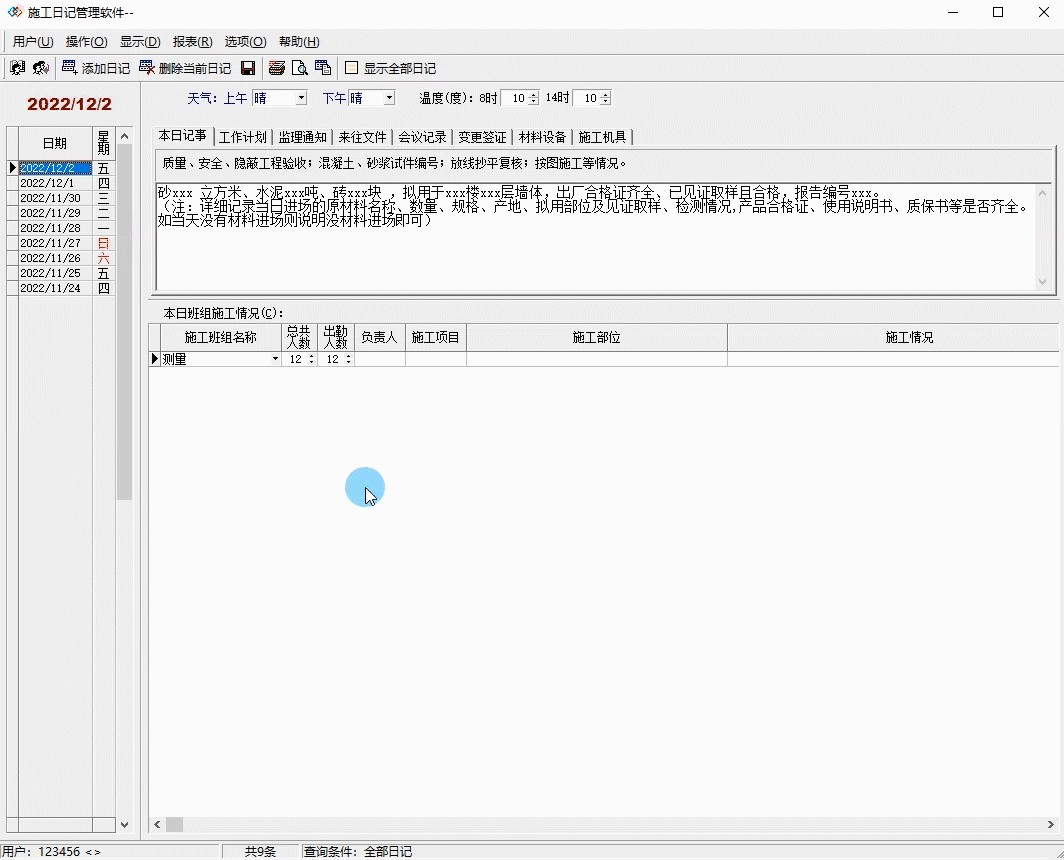 施工日志生成软件:添加日志日期,输入日志内容,工作计划,会议纪要等主要内容,就能自动生成施工日志,支持导出打印,效率简直不要太高!