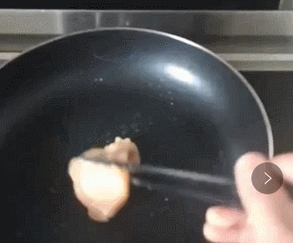 注意:要先进行热锅,然后再刷橄榄油,过程中采用小火慢煎的方法,避免因火过大,油过热而过于焦化。如果出现焦化怎么办呢?拿刀子刮一刮就行了,只是把鸡胸肉上面煎焦的淀粉刮掉而已。