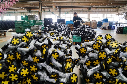 12月27日,河北省平乡县一家自行车、童车生产企业的员工在运输童车零部件。 新华社记者 牟宇 摄