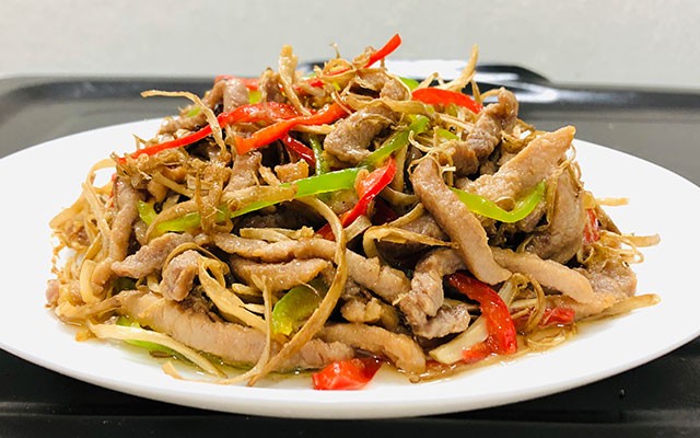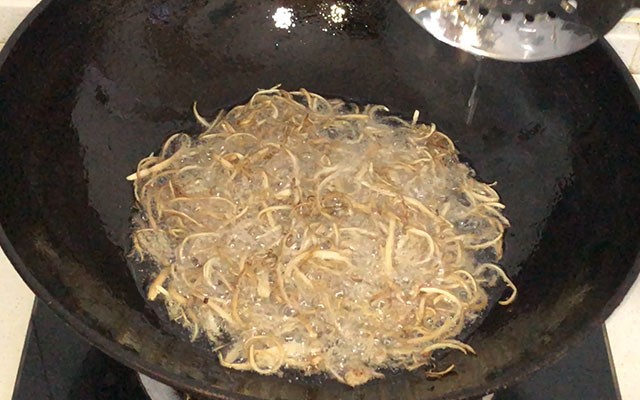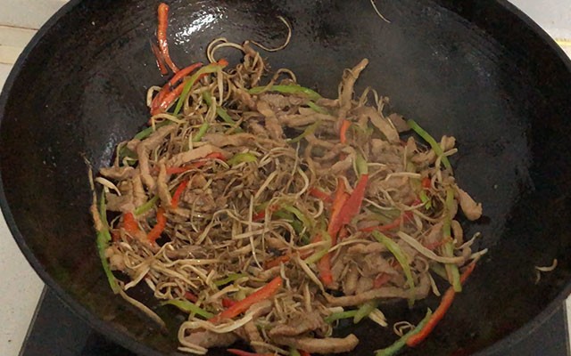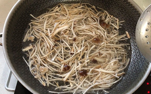 第四步:锅加入稍微多点的油,油温烧至五成热,把茶树菇下入锅中过油几十秒,然后捞出;继续下入腌制好的肉丝,滑油几十秒后捞出。