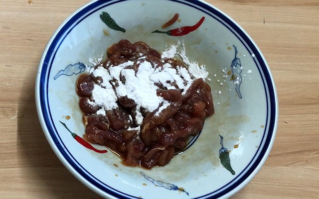 第三步:洗净的瘦肉切成丝,切好后放入碗中再清洗一遍,然后加入少许花雕酒、生抽、蚝油、盐调味,抓匀后再加入少许生粉,继续抓两三分钟腌制即可。
