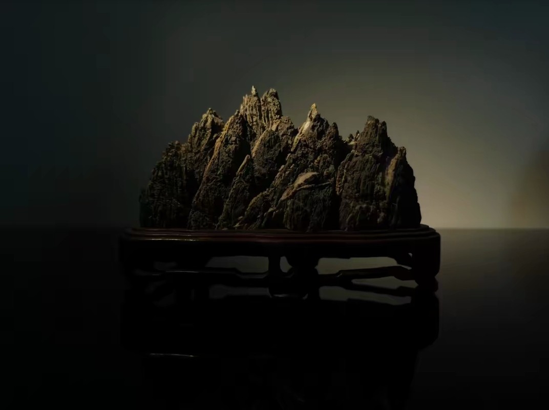 这种青灰色的莲花瓣是磬石高端石质的代表,这种石皮刷洗出来的石肉,观之色泽青黑,触之温润如玉,极具感染力。观此石,圆润饱满,莲花瓣高低起伏,错落有致,山峰之间清崎险峻,群峰卓然而立,形成了一种“会当凌绝顶,一览众山小”视觉冲击感,一时间仿佛真的看到了万里江山。
