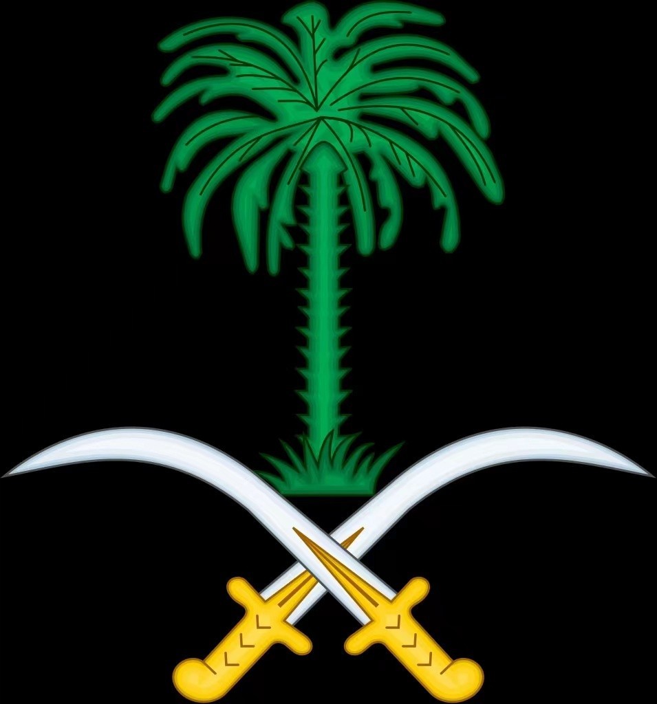 沙特阿拉伯的国徽为绿色,由两把交叉的宝刀和一棵枣椰树组成。绿色是伊斯兰国家喜爱的颜色,象征和平。宝刀象征圣战和武力,代表捍卫宗教和保卫祖国的决心和意志;枣椰树代表农业,象征沙漠中的绿洲。沙特人民也十分喜爱枣椰树,并将其视为捍卫宗教信仰的象征。
