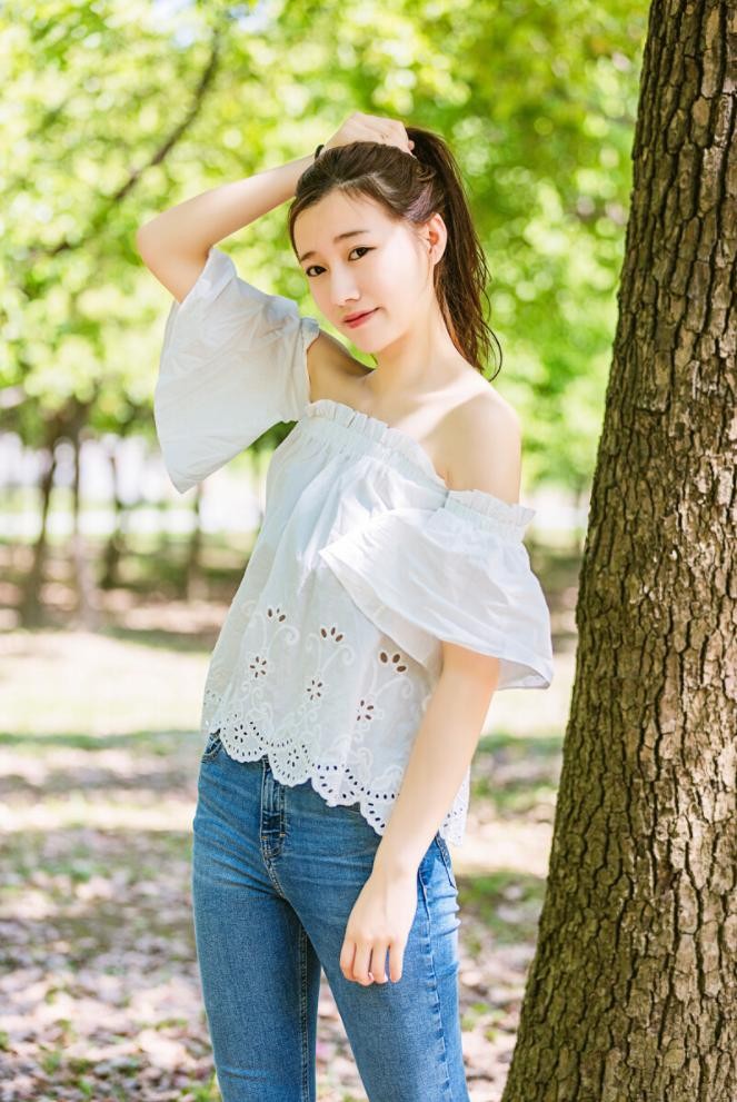 拍户外人像,因为是在户外拍摄的原因,难免会有看镜头尴尬的经历,所以,可以让自己摆拍一个假装害羞,不敢看镜头的姿势,手指可以害羞戳在一起,很调皮可爱。