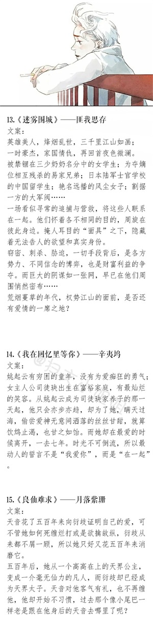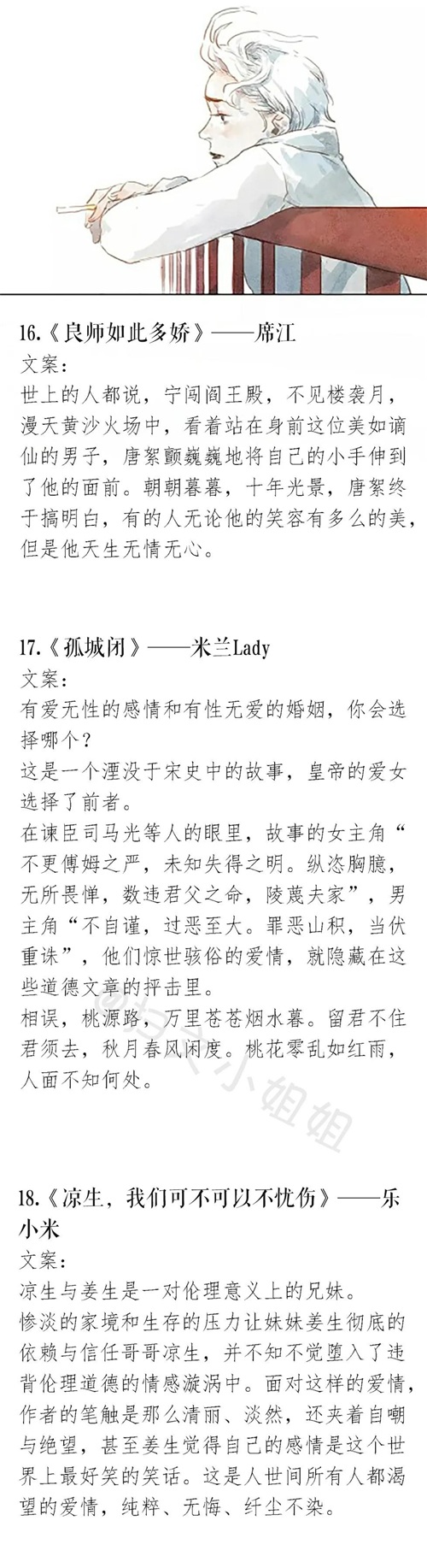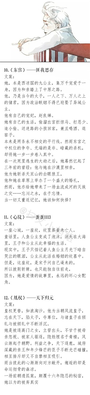 《十年一品温如言》《昭奚旧草》《良仙难求》《废后将军》《春花厌》《东宫》《我的鸵鸟先生》这些都好虐,啊看过好多,我是多找虐,其他的大家可能都听过,《良仙难求》强烈安利一下,哭的我眼泪停不下来那种!