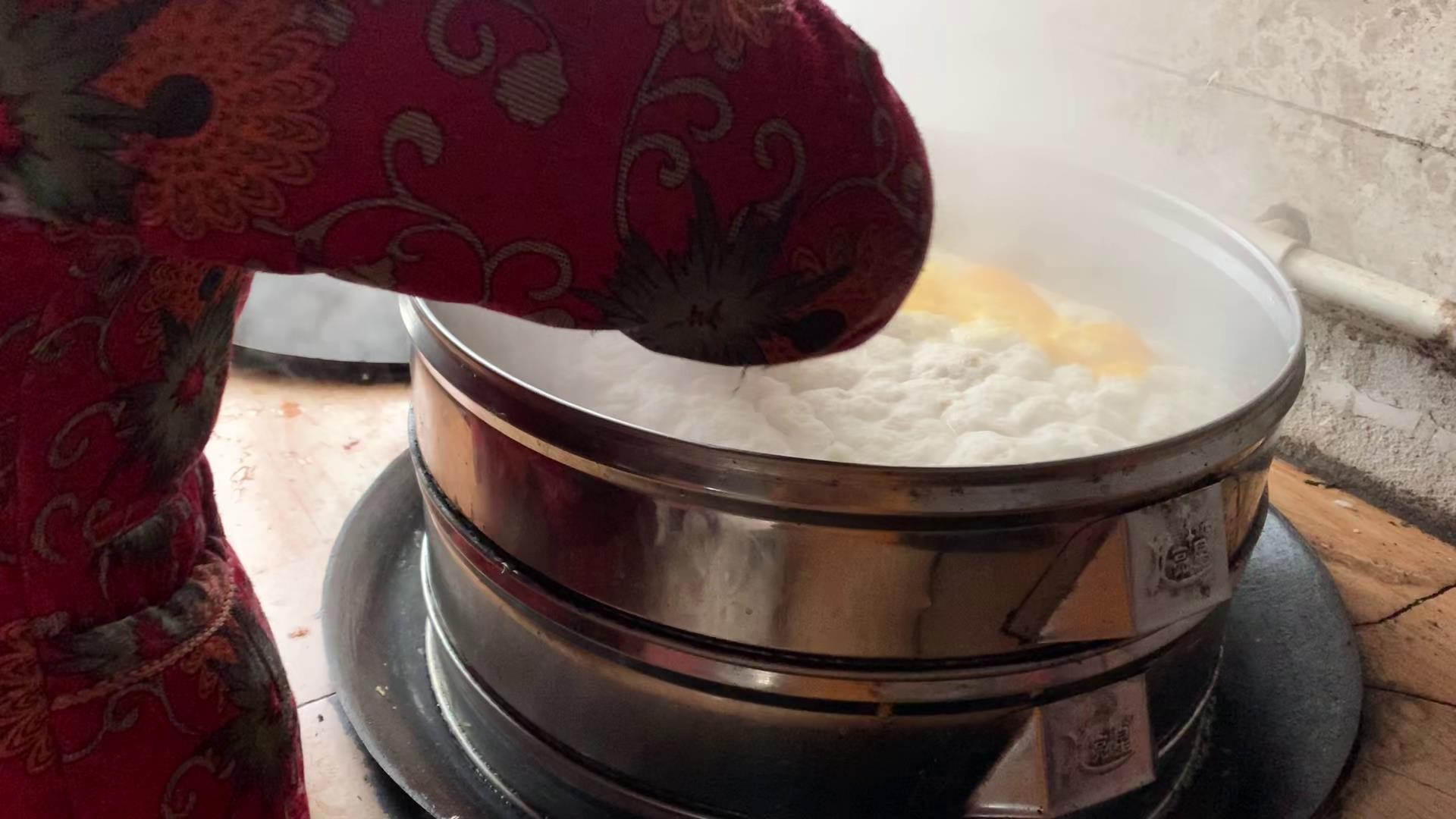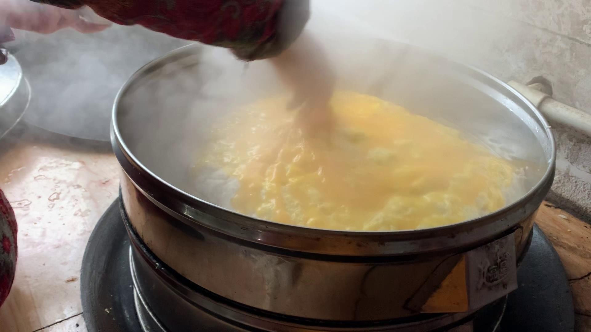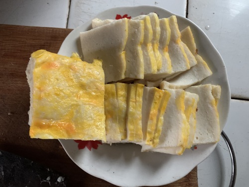 蒸好后,将蛋黄用刷子均匀的刷在鱼糕上面,然后盖锅盖再蒸2-3分钟即可,出锅后将其切成小块,待食用时将其切成薄片蒸一下或是放在菜里炖一下即可食用。