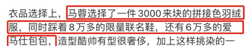 有传言说马蓉的衣服价格不菲。他背的包价值6万多元,脚上的鞋子更贵。它们是限量版,售价8万多元。这件银色拼接羽绒服是其中最贵的。便宜的也要3000多块钱,她全身上下都有几十万的衣服。果然还是一如既往的富婆形象。