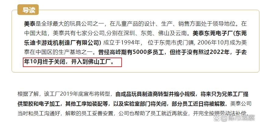 摘要:日前,一则关于“知名玩具大厂-佛山美泰玩具厂将于2024年完成产能转移工作”的消息得以传播,引发玩具行业的广泛关注。这是自美泰东莞工厂被合并之后,又一大商业行动。
